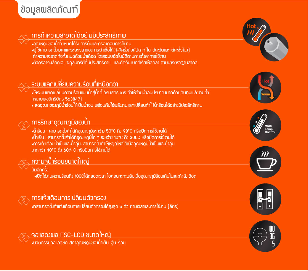 - เครื่องกดน้ำดื่ม ด้วยนวัตกรรม ตู้กดน้ำดื่ม 3 ระบบ ทั้ง น้ำร้อน น้ำอุ่น และ น้ำเย็น โดยกระบวนการต้มน้ำเดือดที่ 100°C เพื่อฆ่าเชื้อ ก่อนผ่านกระบวนการปรับอุณภูมิของน้ำให้เป็นน้ำอุ่น และน้ำเย็น ตามลำดับจึงทำให้มั่นใจได้ว่า น้ำที่จ่ายออกมามีความปลอดภัย จากการฆ่าเชื้อแล้ว