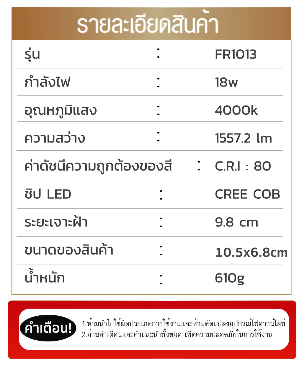 - ห้ามนำไปใช้ผิดประเภทการใช้งานและห้ามดัดแปลงอุปกรณ์ไฟดาวน์ไลท์
