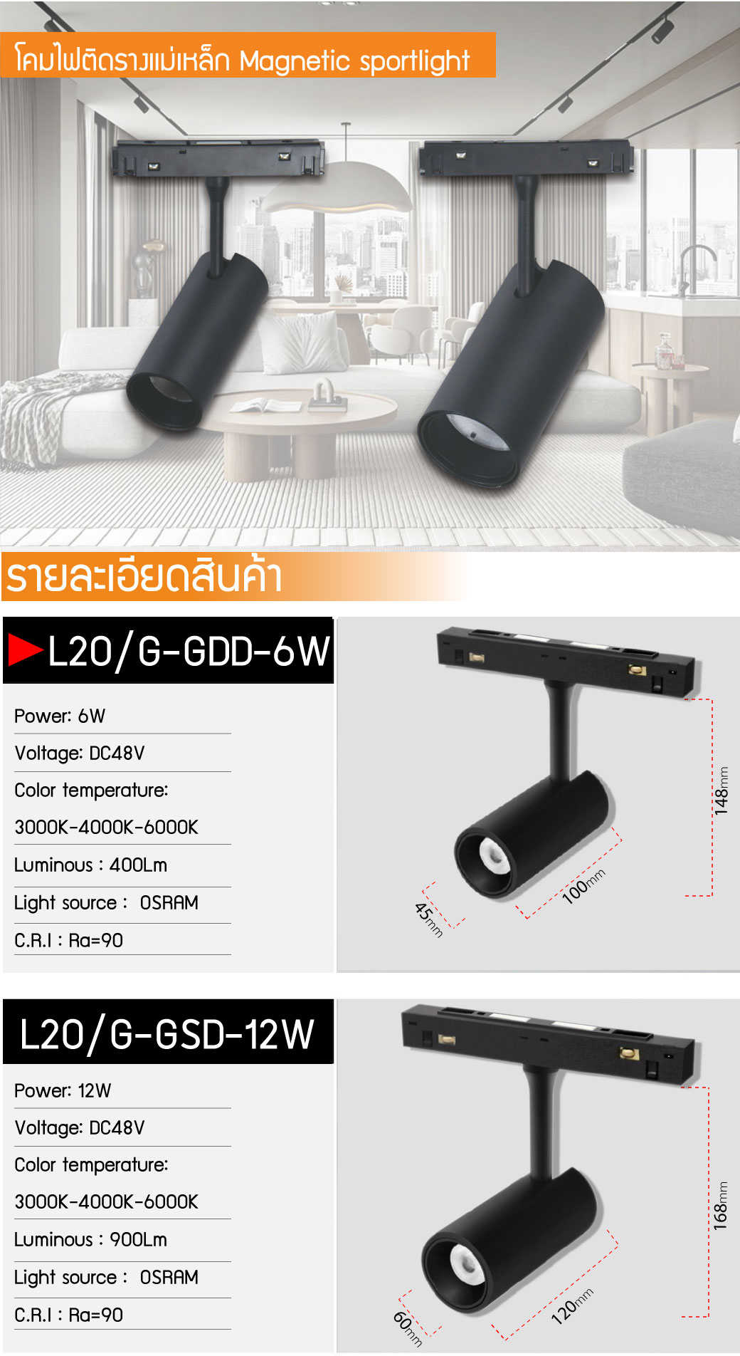 โคมไฟติดรางแม่เหล็ก Magnetic sportlight รุ่น L20/G-GDD-6W