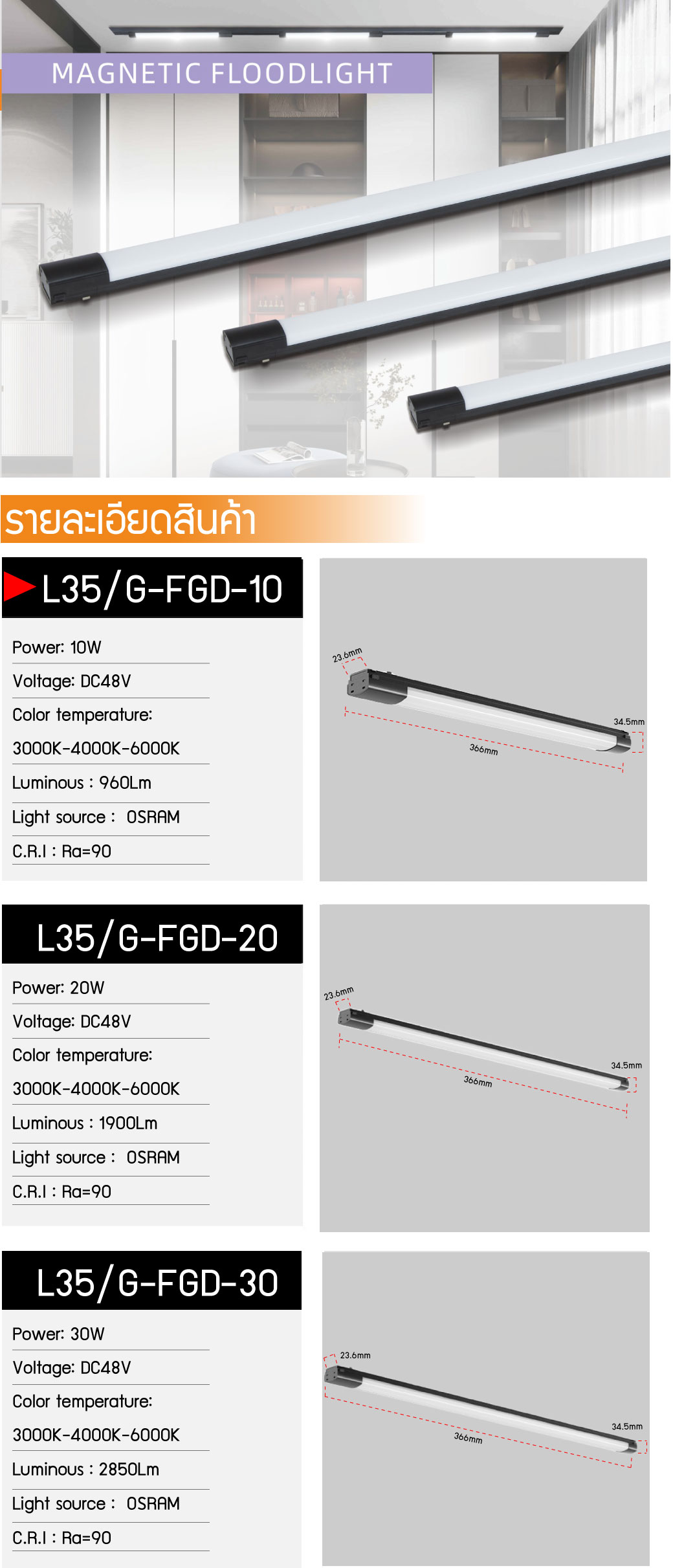 โคมไฟติดรางแม่เหล็ก Magnetic Floodlight รุ่น L35/G-FGD-10