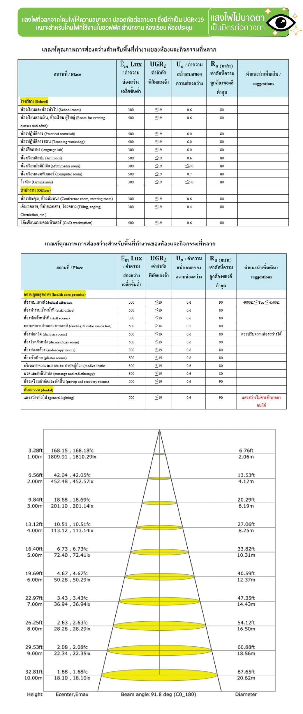 • UGR<19 เป็นค่าที่น้อย จึงทำให้แสงสะท้อนที่ออกจากโคมไฟมีความสบายตา ปลอดภัยต่อสายตา ซึ่งเป็นค่าที่เหมาะสมสำหรับโคมไฟที่ต้องใช้งานในออฟฟิศ สำนักงาน ห้องเรียน ห้องประชุม เนื่องจากช่วยลดแสงแยงตาในขณะเปิดใช้งาน