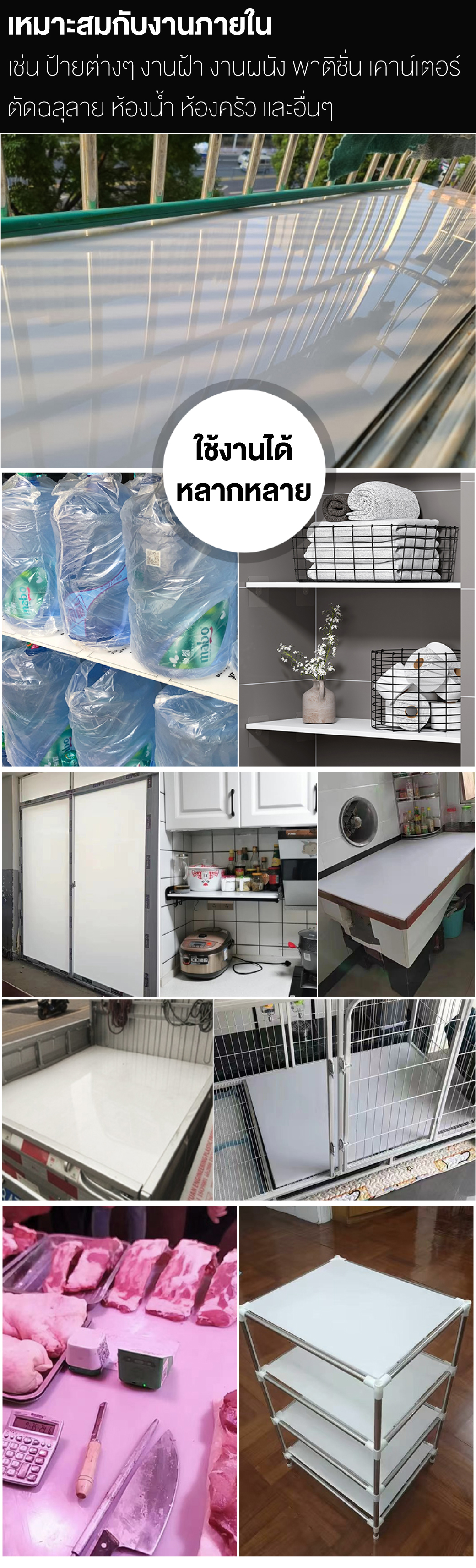 แผ่นพลาสวูด เหมาะสมกับงานภายใน เช่น ป้ายต่างๆ งานฝ้า งานผนัง พาติชั่น เคาน์เตอร์ ตัดฉลุลาย ห้องน้ำ ห้องครัว และอื่นๆ