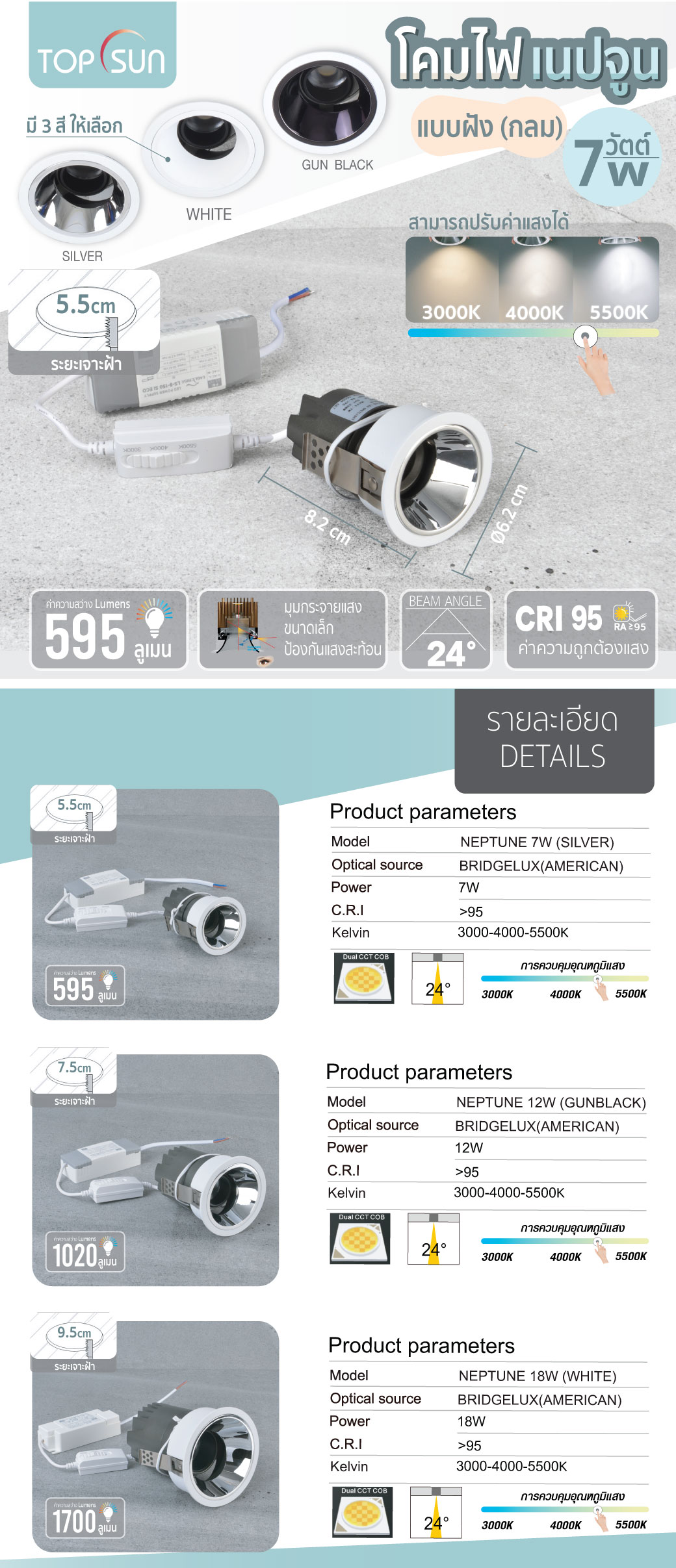 - อุณหภูมิแสง : 3000-4000-5500K(สามารถปรับได้)