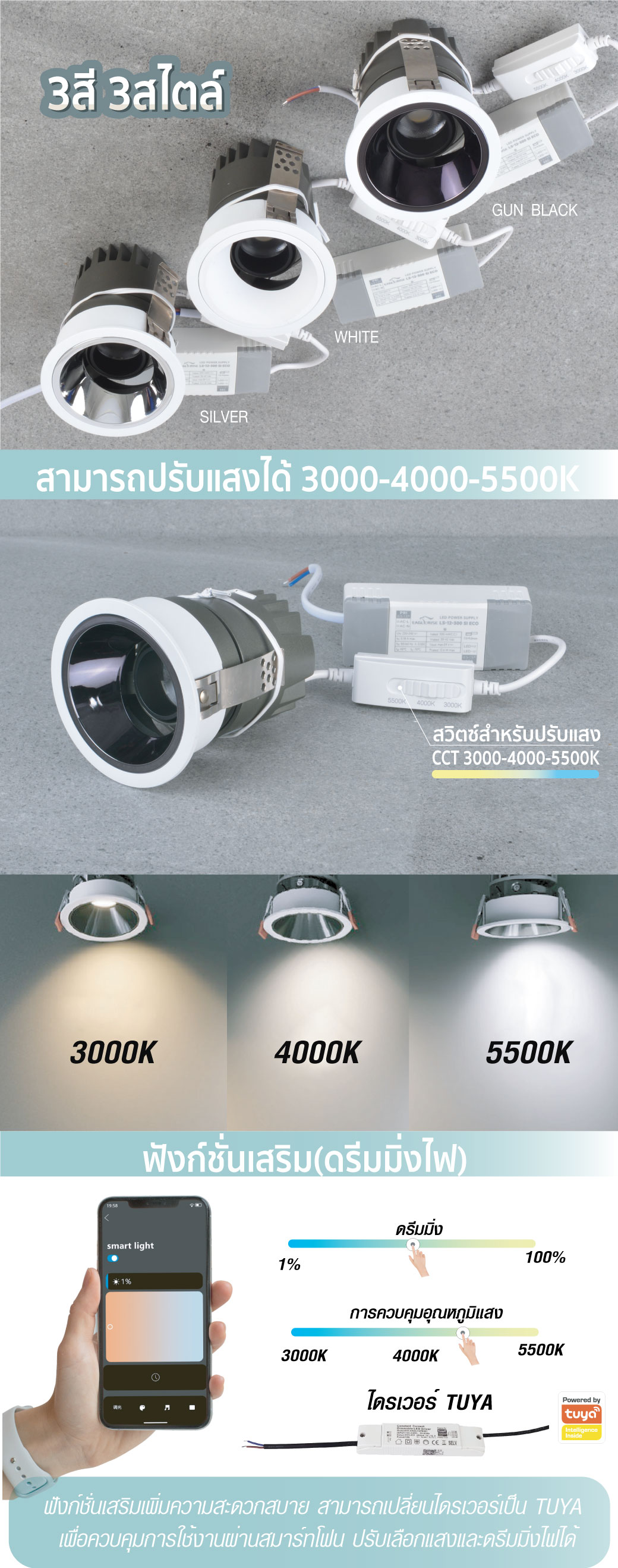 - สามารถเลือกแสงไฟได้หลากหลายแบบ3000-4000-5500k