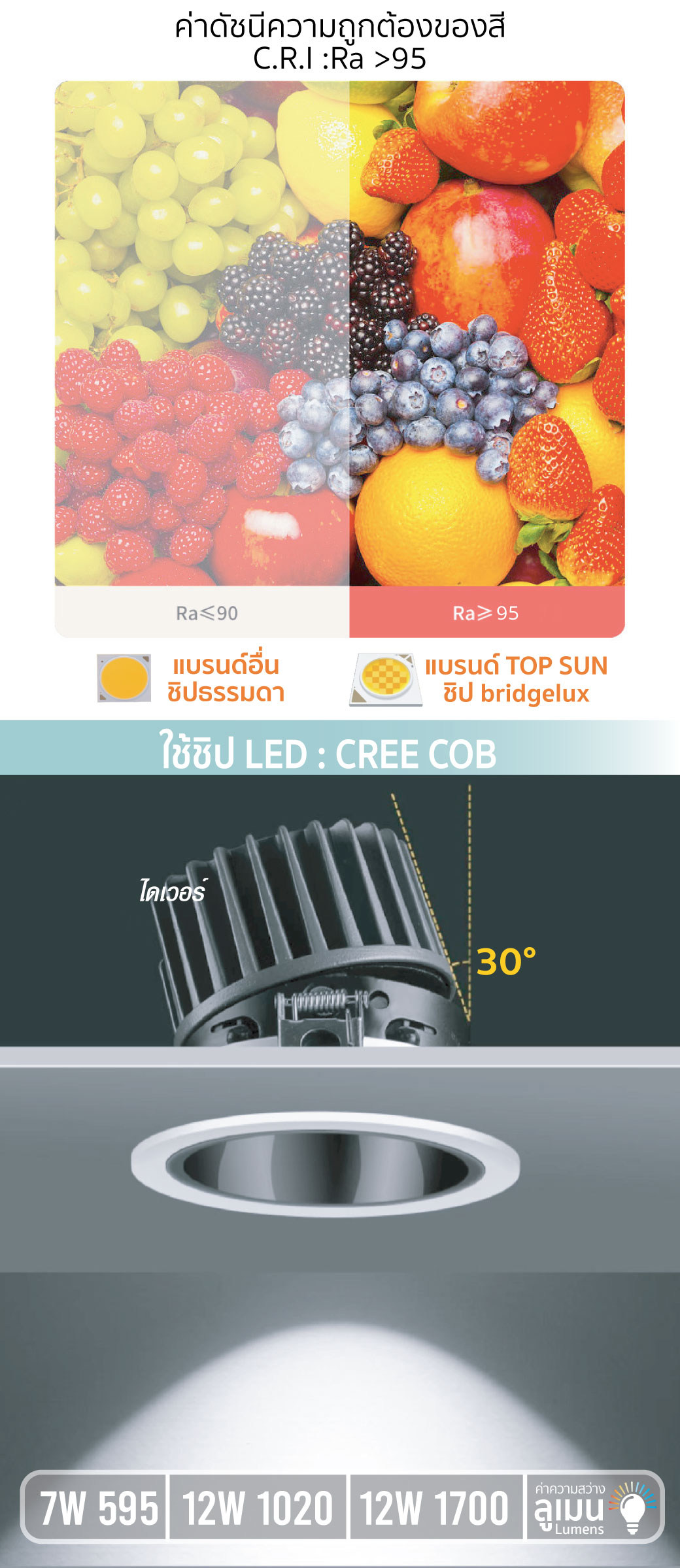 - ค่าดัชนีความถูกต้องของสี / C.R.I : Ra >95